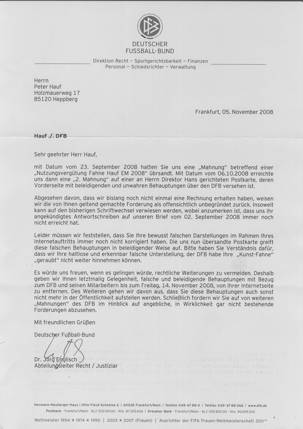 Einschreiben/Rückschein Herrn Dr. Jörg Englisch Abteilung Recht Deutscher Fußball-Bund DFB Otto-Fleck-Schneise 6 60528 Frankfurt am Main “Wahrhaft politisch ist indessen nur solches Handeln, das den Bezug zwischen Gewalt und Recht rückgängig macht.” Giorgio Agamben, Ausnahmezustand; Frankfurt: Suhrkamp 2004, S.104 Ihr Schreiben vom 05. November 2008 Sehr geehrter Herr Dr. Englisch, ich gehe hier mit aller gebotenen Sorgfalt und Aufrichtigkeit detailliert auf alle Ihre Vorwürfe und berechtigten Forderungen ein, die Sie in Ihrem o. g. Schreiben gegen mich erheben; diese sind, wie Sie hier sehen werden, samt und sonders grunsätzlich unrichtig, da sie in all ihren Details und in ihrer Gesamtheit auf einem allein von Ihrer, aber nicht nur aus dem DFB e.V. und der DFB-Wirtschafts- dienste GmbH bestehenden, Seite, wie Sie dort ja selbst schreiben, kreierten, jetzt so heillosen wie ursprünglich berechnenden Wirrwarr beruhen - welches freilich in nicht geringem Maß auf meine Erfolge im Kampf gegen die hier aufzudeckende Intrige um die gesetzeswidrige Erringung der Bestimmungs-hoheit und damit der Nutzungsbestimmung über mein hier in Frage kommendes Werk schwarz-rot-gold in neuer Form ©2007 Peter Hauf, kurz: Hauf|Neue Form per konzertierter Urheberrechtwäsche seitens eines zu diesem Zweck gegründeten ‘Joint Venture’ zurückzuführen sein dürfte. [Die im Folgenden in eckige Klammern gesetzten Einfügugen sind illustrativer Natur und beziehen sich auf eine bestimmte, für mich wichtige Facette der Erkenntnisbeschaffung in dem fortlaufenden Fall, wie ich sie anhand eines kleinen, sehr erhellenden Tools auf meiner Webseite und den mir von diesem stets aktuell gelieferten statistischen, auf die dortigen Besucher bezogenen Daten erhalte und auch dokumentieren kann] 1 Bei jenem (von mir in einer 8 monatigen, strengen Auseinandersetzung mit dem Thema ‘Leitmotiv Schwarz-Rot-Gold’ entwickelten, in Form eines nicht nur visuell innovativen, ‘modernen’ Fahnenbildes gestalteten und als hissfertige Fahne in Unikatauflage verwirklichten) ‘multiplen’ Werk handelt es sich um ein in jedweder Hinsicht urheberrechtlich sensibles und relevantes, freies künstlerisches politi-sches Projekt mit der Veröffentlichungspriorität 28. Mai 2007, das als das Erste seiner Art eine Gattung von Fahnen(bildern) ins Leben ruft, die über den von ihnen auf der einen Seite bezeichneten Rahmen der souveränen Ländernationalität auf der anderen Seite hinauszuweisen vermag. 2 (Kann übersprungen werden, wenn’s zu kompliziert erscheint) Eine derart neue, neuartige, zugleich politisch zeitgemäße und kulturell-zivilisatorisch zukunftsträchtige, postsouveräne, weder aus der Luft gegriffene noch in Wirklichkeit auf irgendein bereits vorhandenes Element in seinem aktuellen Zustand zurückgreifende Bildung dürfte in Deutschland den vollen urheberrechtlichen Schutz genießen (vgl. dazu auch den Punkt Schlussbemerkung A), da sie nämlich erst möglich wird, - wenn durch ein genaues Erkennen jedes einzelnen Elementes und seines Zustandes in einer bereits existierenden Ländernationalfahne und deren Geschichte, d.h. -- diese dort zur Repräsentation eines ganz bestimmten, landestypischen Dispositivs der Macht, das im Falle Deutschlands eindeutig aus den 3 höchstrangigen Bannerfarben des (offiziell 1806 erloschenen) Heiligen römischen Reiches deutscher Nation mitsamt den durch sie herübergekommenen beiden, die Basis der heutigen Rechtsordnung in der heutigen Deutschlandfahne noch leitmotivisch konstatierenden rechtlichen Grundelementen des --- a) Normativen (schwarz-gelb, “die Farben des Kaisers”, das kaiserliche “Reichspanier”), sowie --- b) des Anomischen, Metarechtlichen (rot, in anomischer und metarechtlicher Identität “die Farbe Michaels, des Patrons des o.g. Reiches”, mythologischer oberster “Richter am Jüngsten Tage”, “dessen Name bedeutet: Wer ist wie Gott, und dessen Farbe Rot ist in all seinen Schattierungen”, konsequenterweise also eben auch die Farbe des im Mittelalter neben den Farben des Kaisers bei bestimm-ten “staatlichen” Anlässen gebräuchlichen “Blutbanners”) besteht, -- welche hier gegen die Regeln der Heraldik, also gewaltsam, zu konsequenterweise einem Bild der Gewalt, also zu der - wie sich zeigen lässt - Visualisierung des Zustandes des Rechts und seines Gebundenseins - im Ausnahmezustand (näheres auf meiner Website www.peterhauf.com) - an das Leben zusammengefügt und damit zu der Fahne schwarz-rot-gold geformt werden, -- die damit also schließlich ein Dispositiv, in dem die Gewalt mit dem Recht schachert, verkörpert, dieses als sein eigenes Bild am Ort einer Ländernationalfahne darstellt und jenes dadurch als das bestimmende Leitmotiv zum Ausdruck bringt, also ein solches in seinen Achsen als das deutsche Hoheitszeichen, das Symbol der deutschen staatlichen Souveränität repräsentiert, - welches jedoch somit und zugleich mit der europäischen Entwicklung als überkommen erachtet werden kann, - wenn also die neue Gestaltung die Einzelelemente des Gesamtaggregats aus ihrem von diesem in den vergangenen Epochen typischerweise zu einer Parole eingefrorenen und damit erstarrten Zustand zu “ent-setzen” weiß und diese der Sprache als solcher wieder zurückgibt, - und damit erst das Leben der in der Wirklichkeit immer stattfindenden kulturellen, damit auch spirituellen Evolution zurückgegeben werden konnte. Die hier von Ihnen in Frage gestellte Bildung dürfte jenen Schutz gerade deshalb auch vollumfänglich genießen, weil sie ihr Ziel, eine ‘Entsetzung des Rechts aus den Fängen der Gewalt’ (W. Benjamin, 1921) darzustellen, erreichen konnte, nachdem es dem Urheber dieses Werkes gelungen war, eine grafische Sprache dafür zu entwickeln, und diese auch in ein vollkommen neues Werk der bildenden Kunst, das seinen Voraussetzungen gerecht wird, umzusetzen, das nämlich nun eine Deaktivierung jenes alten Dispositiv darstellt, ohne dabei den B