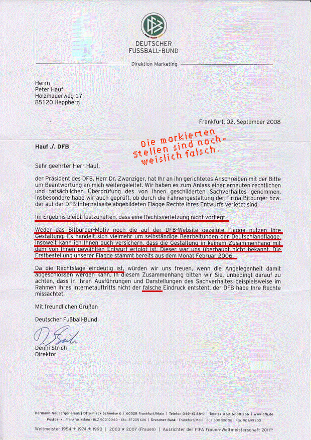 DFB Otto-Fleck-Schneise 6 60528 Frankfurt DFB./.Hauf Hepberg, den 6.September 2008 Sehr geehrter Herr Strich, Ihr Schreiben vom 2.September mit Poststempel vom 5.September ist heute bei mir eingegangen. Sie haben es nunmehr, selbst nach eingehender juristischer Evaluierung meiner Texte und Abbildungen auf den Seiten Aktuell und spirit+projekte_NeueForm auf dieser Website durch die von Ihnen eingesetzte, bedeutende Rechtsanwaltgesellschaft Beiten Burkhardt/Muenchen, zum drittenmal versaeumt, auf meine konkrete Provokation mit dem Vorwurf der Hehlerei auch konkret einzugehen; nach wie vor gebrauchen Sie (mittlerweile doch laengst widerlegte und entkraeftete) Ausfluechte und scheinen zu glauben, dass es hinreicht, mir den Mund zu verbieten. Dabei wiederholen Sie mir gegenueber, wie ich annehme, bloss woertlich die - typischerweise wieder auf Ihr Konto umgebuchte - Haelfte der eloquenten Expertise von Beiten Burkhardt, 'dass eine Rechtsverletzung nicht vorliegt', waehrend deren andere Haelfte hoechstwahrscheinlich dahingehend lauten duerfte, dass dies so lange der Fall sein wird, wie Sie meinem - nicht aus der Luft gegriffenen - Vorwurf nicht auch konkret begegnen und zugeben, wo Sie ihre Werbemittel her haben, die meiner Schoepfung in so augenscheinlicher wie unverschaemter Auffaelligkeit von der Backe geschnitten sind, und welche in erster Linie durch den Missbrauch, den Sie damit betreiben, in ihrer an sich kontraeren Bedeutung skrupellos - ich nehme jetzt an: absichtlich - zerstoert wird. Ihre Formulierungen "Deutschlandflagge" (es geht auf meiner Seite um eine echte, neuartige, offene Kunst-Fahne, die von mir nicht zu irgendwelchem Ge- oder Missbrauch als Fahne im Sinn einer Repraesentation irgendwelcher - und schon garnicht kommerzieller - Bedingungen gedacht ist, sondern gerade bewusst ueber derlei Ueberkommenheiten hinaus geht), "gewaehlter Entwurf" (es handelt sich bei mir um eine eigenschoepferische Leistung) und "Erstbestellung" (ist urheber- und wettbewerbsrechtlich vollkommen irrelevant; ausserdem hat man das Werbemittel, von dem Sie an der Stelle sprechen, erst Anno 2008 unter Ihrer Marke zu sehen bekommen) etc. haben keinen Bestand. - Daraus wollen Sie die Summe einer "eindeutigen Rechtslage" gezogen haben? Sie haben bloss den Ball ein weiteres mal ins Leere geschoben und sind der befriedigenden Regelung in der Angelegenheit, um die ich Ihren Chef ersucht und die ich (jetzt vergebens) von ihm gefordert hatte, erneut so feige, unverschaemt und verantwortungslos wie moeglich aus dem Weg gegangen. Sie benennen auch wieder keinen Gestalter fuer "Ihre Fahne"; der DDR-Look Ihrer "DFB-Deutschlandfahne" deutet auf 'meine' Fahnenfabrik. - Diejenige Person, die der Justiziar von Bitburger in seinem Schreiben vom 6.6.08 - ebenso wie "die verantwortliche Projektleiterin" dort - bei GVK (aeusserst vage) "benannte", und die mir nicht Entsprechendes am Telefon gesagt hatte, wollte dann auch nicht schriftlich diese Rolle uebernehmen: niemand hat sich bisher konkret fuer Sie zu dieser Funktion bekannt. In dem Vorgang, der sich gut als ein 'Staffellauf der Faelschungen' darstellen laesst (siehe Aktuell ), geht es meines Erachtens darum, dass Sie und Ihr Sponsor Bitburger auch nur Werkzeuge eines Masterminds sind (der die Rolle des 'aus gutem Grund' durch Sie permanent verdeckten, illegitimen 'Lenders of the Last Ressort' meiner von ihm gekaperten Leistung uebernommen hat), den Sie - jetzt in der Falle des korrupten Deals sitzend, doch ganz nebenbei sehr wohl mit dessen kryptischen Naziprojekt konform, nicht wahr - eben auf Teufel komm 'raus decken muessen. Das Angebot naemlich, das er Ihnen - mit meiner Leistung und daher illegalerweise - gemacht hat (und auf das Sie bewusst eingegangen sind), bedeutete, dass Sie fuer die kreative Schluesselleistung, die Sie in einer Kampagne zur EM 2008 benoetigten, nichts zu bezahlen brauchten. Ich sehe hier einen Vorgang aehnlich dem der Geldwaesche: der erste (geraubte) "Betrag" ist "gratis" und muss daher um jeden Preis in seiner Herkunft verhehlt werden; ein nachhaltig erfolgreicher Weg in dem Zusammenhang hier waere etwa eine solche Verramschung eines Originalentwurfes, wie er in Ihrer EM-2008-Kampagne stattgefunden hat. Zum Schluss wird der 'Mastermind' meine Fahne - unter seinem Interpretationsmonopol - jedoch, frisch gewaschen, als die des von ihm favorisierten Lagers - mit einer von ihm gesteuerten, weiter auf das Gruendlichste gefaelschten Identitaet UND Klientel - "aus der Taufe heben" und vorlegen koennen; denn er braucht dann bloss zu behaupten, es waere seine selbstaendige Weiterentwicklung der DFB- und Bitburger-/DFB-Flaggen 2008, die ja im Grunde auch von ihm kam und alles bloss seine "selbstaendige Bearbeitung der Deutschlandflagge" ist. Die "Kaufkraft", um im Bild zu bleiben, meiner fuer eine "KOMMENDE Gemeinschaft" (siehe spirit+projekte_Aktuell) gedachte, offene Fahne wird sich dann vollends auf die vernagelte UEBERKOMMENE Gesellschaft uebertragen haben, deren Kritik sie in Wirklichkeit gewesen ist... -Wer weiss, vielleicht wollte der 'Mastermind'/Fahnenhaendler - zusammen mit Ihnen und dem einen oder anderen Zyniker bei Bitburger - meine Fahne ja bloss in dem fuer alle drei beteiligten Marketingabteilungen hochinteressanten Spektakel der EM verbrennen, nach dem zugkraeftigen, hierzulande doch bestimmt noch validen Motto “Wehret den Anfängen" oder so, das schon immer eine Bande fuer eine kleine Sauerei unter ein Dach zusammenbrachte und diese in eine Staatsaktion zu verwandeln verstand? In jedem Fall wird aber - in einem faelscherischen, kulturell hoechst manipulativen Vorgang und mittels Ihrer mehr oder weniger freiwilligen Hilfestellung - nicht nur das Urheberrecht, das Sie und Bitburger generell - zu Ihren Gunsten - ignorieren zu koennen glauben, gewaschen worden sein, sondern mit der mir von Ihnen und dem 'Mastermind' aus der Hand gewundenen Fahne die Geschichte der deutschen Fahnen als solche gleich mit dazu. Unter dem Strich bleib