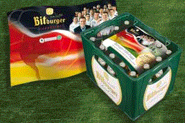 "Die limitierte Bitburger-/DFB-Flagge 2008" wird allein als 'Autoflagge' im Mai/Juni 2008 1,3millionen mal in Bitburger-Bierkaesten verteilt, sowie in unbekannter Auflagenhoehe als 'Schwenkflagge' vertrieben; sie ist das Kernstueck der Bitburger On- und Offline- Werbekampagne zur Fussball-EM 2008 - und dient in einer anderen, hier als ein 'Hintergrund' eingesetzten und dem "Premiumpartner" DFB zur Verfuegung gestellten Entstellung zugleich als Alibi fuer den Missbrauch durch Bitburger und als ebenso grosser wie lukrativer Merchandisingtraeger fuer die Marketingabteilung des DFB - sowie nicht zuletzt als "neue DFB-Farben" mit einem "Deutscher-Fussball_Bund"-Kuckuck als "DFB-Deutschlandfahne". |