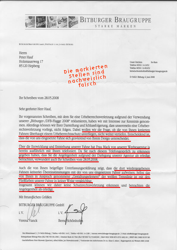 Typisch fuer Plagiatsvergehen ist auch die Berufung auf ein Betriebsgeheimnis durch den selben Absender (siehe den Vorgang ganz rechts). In der Mitte, unten, befindet sich das erste Anwortschreiben, das ich von Bitburger erhalten habe... |