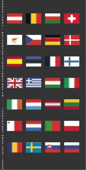 europlural Sammlung neuartiger Fahnen ©Peter Hauf 2006-2009 REGISTERED Copyright (1990-2009): Das Symbol rechts oben (sowie neben den Fahnen), bei der in 'europlural' selbstverstaendlich mit aufgenommenen 'Schweiz', ist mein rechtlich international und vielfach geschuetzter Titel 'tantrayana' (rDzogs-chen ) oder "Das Diamantfloss" aus dem Zyklus "free sun"; siehe dazu auch weitere Beispiele und Arbeiten in anderen Sektionen hier. All material herein Copyright©1990-2009 Peter Hauf. All rights reserved. |